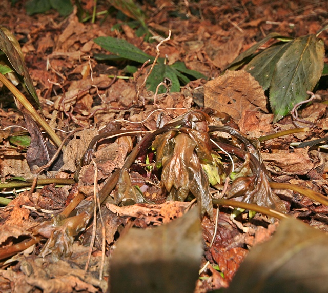 Selbst die Exemplare, die im Schutz auf der Westseite unseres Anbaus stehen, sind dahin. Auch Helleborus foetidus hat braune matschige Blüten und die dekorativen palmwedelartigen Laubblätter sind schwarz, als ob sie irgendeinen Pilz hätten.